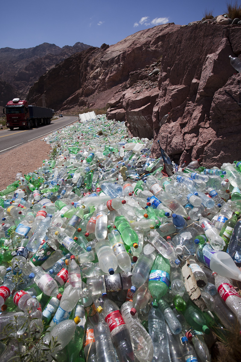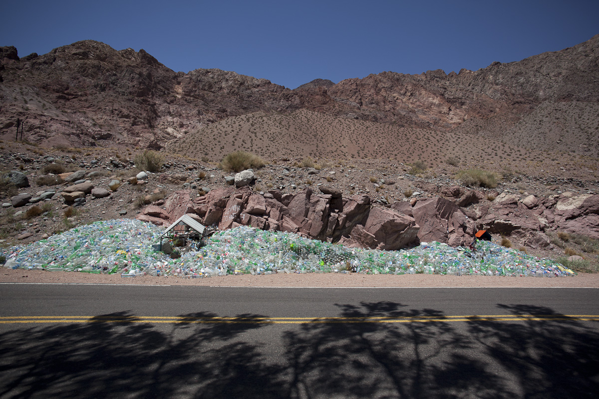 I don’t know which site was more spectacular…and for the same reasons! Thousands and thousands of stacked plastic bottles of water sparkling in the afternoon sun, completely surrounding and overtaking the small religious stand….or South America’s highest mountain topped by a 300 meter deep glacier framed by emerald green grass and crystal clear water.