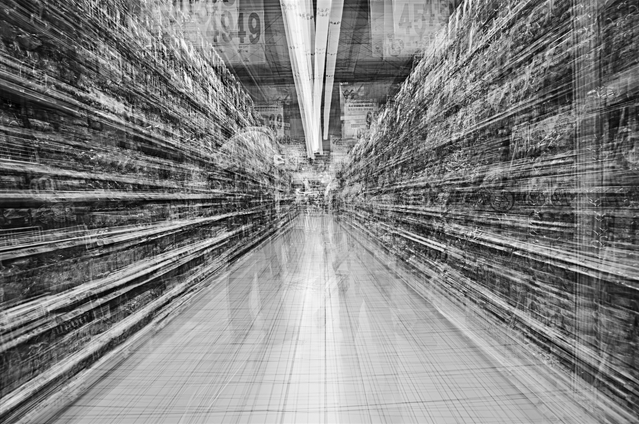 These images are distressing, vibrating captures of what it can feel like to be bombarded with many different sources of visual stimuli. They simulate what a consumer might feel as they stroll down a supermarket aisle, but the the images also create a fascinating pattern of intersecting delicate lines and rectangles overlapped with amorphous human forms. The humans seem like a footnote in the frenetic environment they helped create.