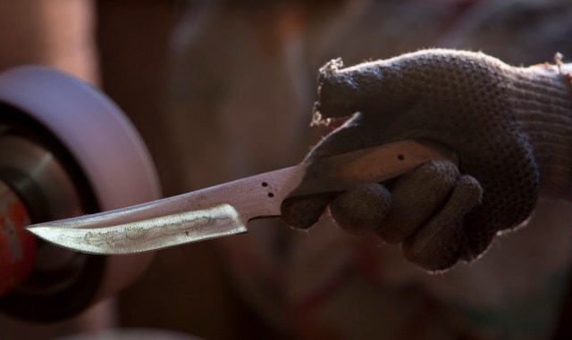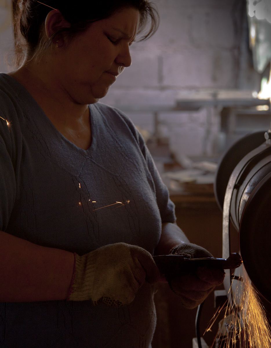The hunk of metal was now red hot and Alfredo began to pound it into shape. Steam vapors came off the metal as he cooled it in a bucket of water. He brought the knife over to the grinder and I watch the sparks fly. Step-by-step the black steel was transformed into a gleaming razor sharp blade.